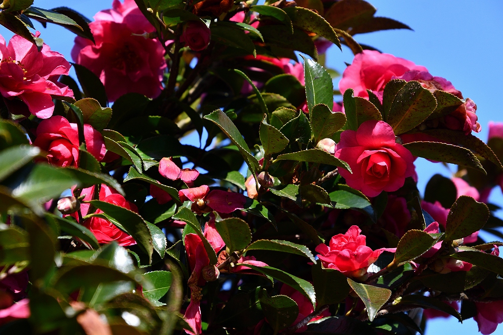 サザンカの赤が陽を浴びてきれいです。