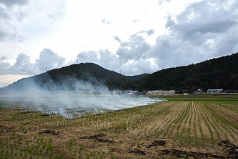 野焼きの煙がたなびいています。