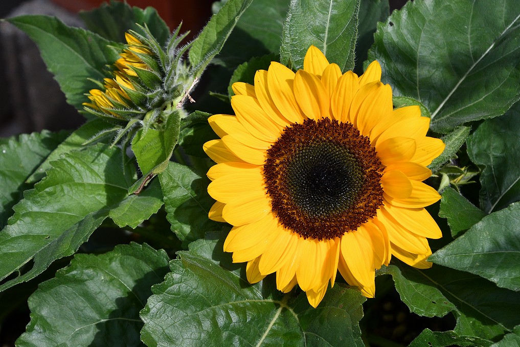 遅蒔きのヒマワリも花をつけました。