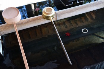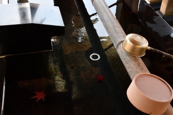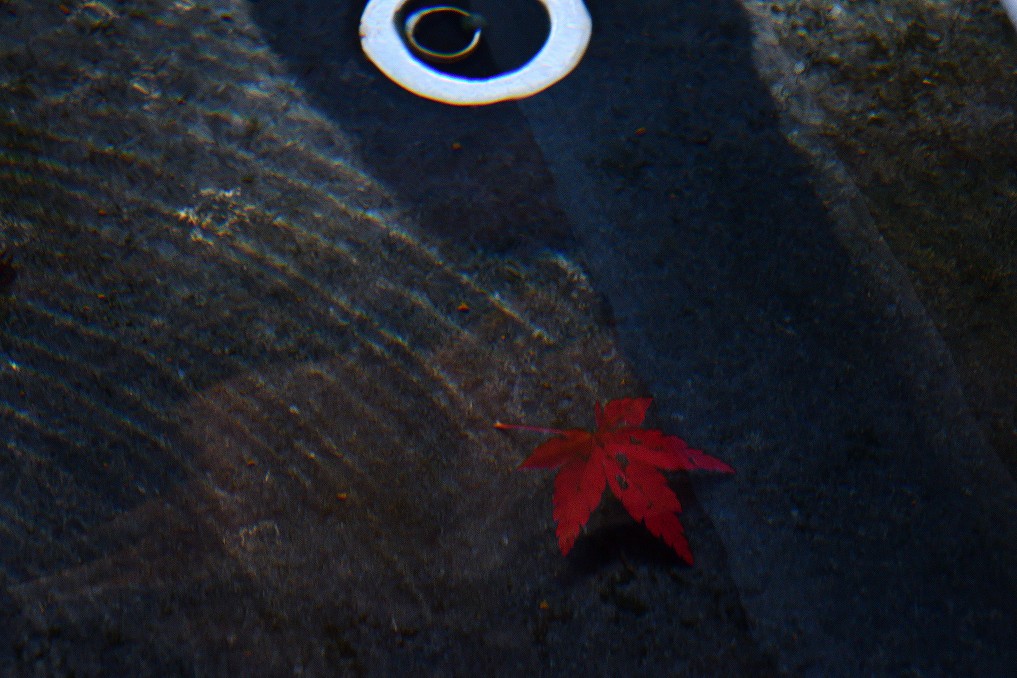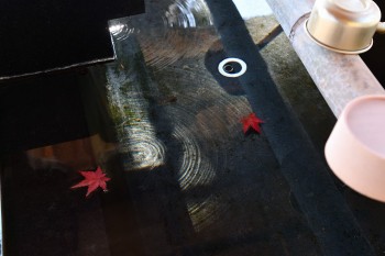 神社の手水舎にモミジの葉が沈んでいました。