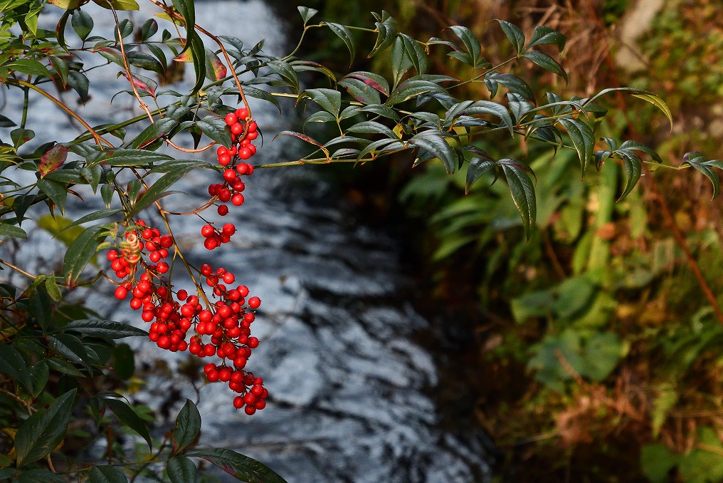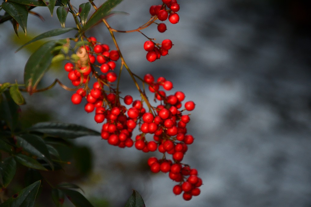 川の水面に当たった光がナンテンを照らしていました。